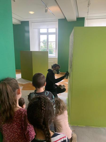 Beim zweiten Besuch im März duften wir einem richtigen Künstler bei der Arbeit zuschauen. KEF!, der eigentlich Simon Röhlen heißt, hat große Blöcke mit Graffiti gestaltet. Dafür hat er ganz viele geschwungene Linien in Schwarz, Braun und Grau gesprüht. Weil es nicht gesund ist, die Farben einzuatmen, hat er dabei eine Maske getragen. Es war total spannend, ihm zuzugucken!