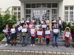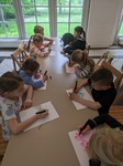Beim dritten und letzten Besuch im Mai konnten wir die fertige Ausstellung von KEF! besuchen. In manchen Räumen waren die Wände und die besprühten Blöcke ganz grün. Außerdem lief eine Entspannungsmusik und es war fast so, als ob wir durch einen Wald laufen würden. Von der Decke hingen kleine Formen aus Styropor, die wie Wolken oder Regentropfen aussahen. Es gab an den Wänden auch einige Kunstwerke mit vielen bunten Linien und ein Bild mit Spiegelfolie, das war witzig. Danach durften wir auf weißen Blättern mit Filzstiften eigene Kunstwerke aus Linien malen. Wir waren ganz konzentriert und wollten gar nicht mit dem Malen aufhören, als wir zurück zur Schule gehen mussten. Jedes Bild ist ganz besonders und wir sind richtig stolz auf unsere Kunstwerke!