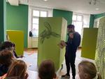 Frau Schöne, die im Museum arbeitet, hat uns erst einmal herumgeführt. Wir sind durch die verschiedenen Räume gelaufen und haben uns zum Beispiel einen alten Teil der Gocher Stadtmauer, ein riesiges schwebendes Dino Skelett aus vielen Einzelteilen und ein Mobile aus Schweinepfoten und -ohren angeschaut. Das war ein bisschen gruselig. Einige Räume waren leer, weil das Museum gerade für die nächste Ausstellung vorbereitet wurde. In einem Raum haben wir am Ende eine Schatzkiste gefunden. Gemeinsam durften wir sie öffnen und darin waren Lollis für die ganze Klasse!