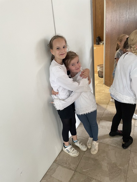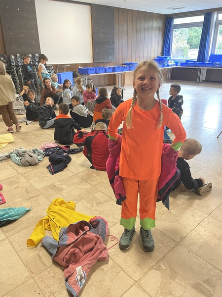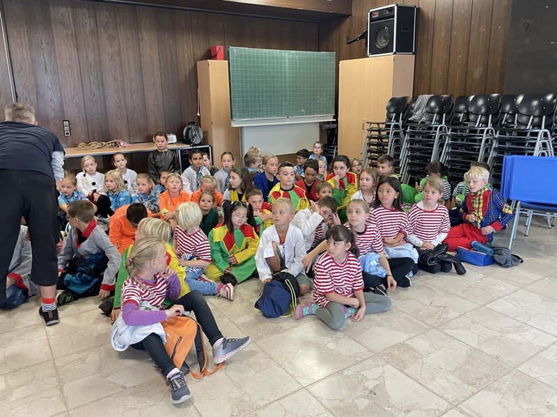 Die Artisten, die Bodenakrobaten und die Jongleure waren in der Turnhalle. Die Fakire und die Zauberer waren im Inklusionsraum. Die Kinder sind bei der Aufführung in Rollen geschlüpft und dazu gab es Kostüme. Die Artisten, die auf der Kugel waren, waren als Schneemann verkleidet. Und die, die Seiltänzerinnen waren, haben sich als Pilot verkleidet. Die Bodenakrobaten waren als Hawaiianer verkleidet. Sie wurden auch Bodenchaoten genannt. Die Jongleure waren als Astronauten verkleidet. Die Fakire haben sich sehr unterschiedlich verkleidet. Manche haben sich als König verkleidet, manche waren Helden der Kinder, es gab aber auch noch einen Ninja. Es gab Mülltonnen Zauberer. Sie hatten sich einfach eine Jacke über die Kleidung drübergezogen und auf dem Kopf war eine Cappy. Und die Zauberer haben sich als Zauberer verkleidet. Die Erfinderclowns hatten eine graue Perücke und einen weißen Mantel an. Es gab einen Clown und einen Jäger. Der Jäger hatte eine Waffe und einen braunen Anzug.