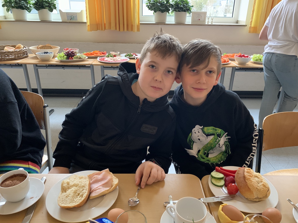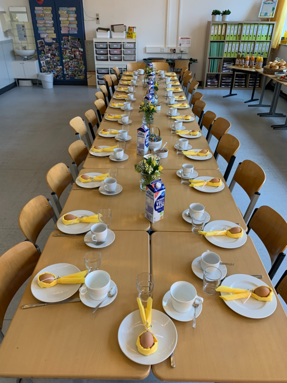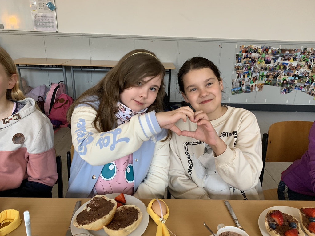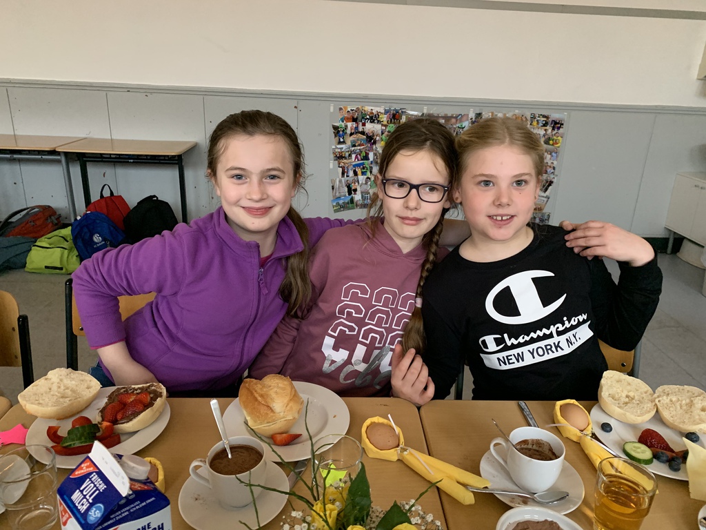 Am Freitag vor den Osterferien haben wir von der 4c ein Osterfrühstück gemacht. Es gab sehr viele leckere Sachen zu essen, zum Beispiel Milch, Kakao, Brötchen, Nutella, verschiedene Wurstsorten (Geflügel, Veggie), Käse und mehr. Zu trinken gab es Multivitaminsaft und andere Säfte. Es gab auch so viel leckeres Obst, zum Beispiel Erdbeeren und Kiwis. Es war alles so lecker! Uns allen hatte es sehr gut geschmeckt, unserer Lehrerin Frau Tissen auch. Am gleichen Tag hatten wir auch die Fahrradprüfung.
