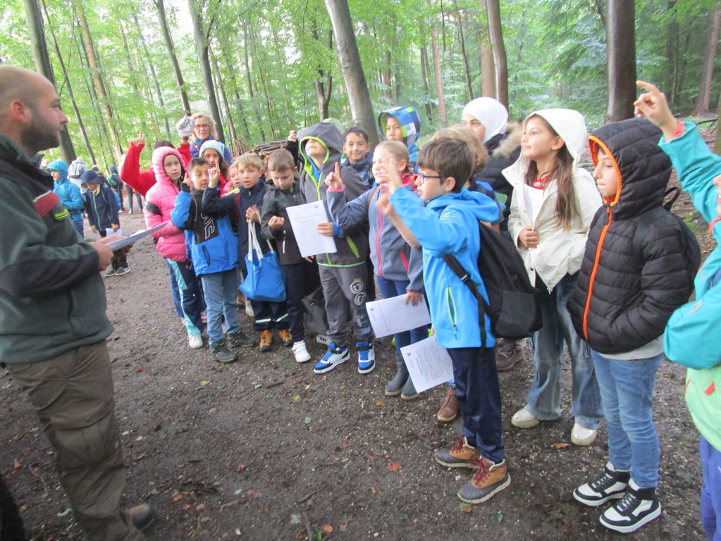 Am Wald angekommen, haben wir uns in einer Zweier-Reihe aufgestellt. Der Förster begrüßte uns freundlich mit einem „Guten Morgen“ und erklärte uns die Regeln. Danach haben wir Blätter mit 19 Aufgaben bekommen, die im Wald an verschiedenen Stellen gelöst werden mussten. Jede Aufgabe war mit einer Nummer gekennzeichnet, die wir an den Bäumen finden mussten.
